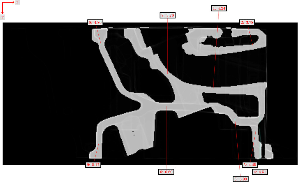 Egy hengerfej keresztmetszeti CT képén megadott pontokban “mért” legkisebb falvastagság értékek láthatók a képen