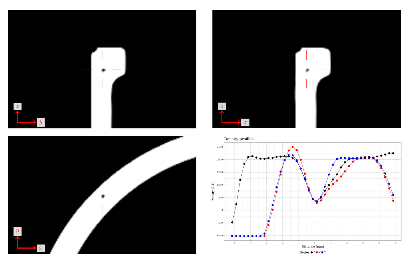 A képen egy zárvány különböző, egymásra merőleges síkú reprezentációja és egy denzitás profil látható. A szálkereszt jelöli a zárványt. A denzitás profil szempontjából a szálkereszt középpontja jelöli a 0 pontot. A denzitás profil jól bemutatja, hogy a zárvány környezetében hogyan változik a denzitás értéke x, y, z irányban.